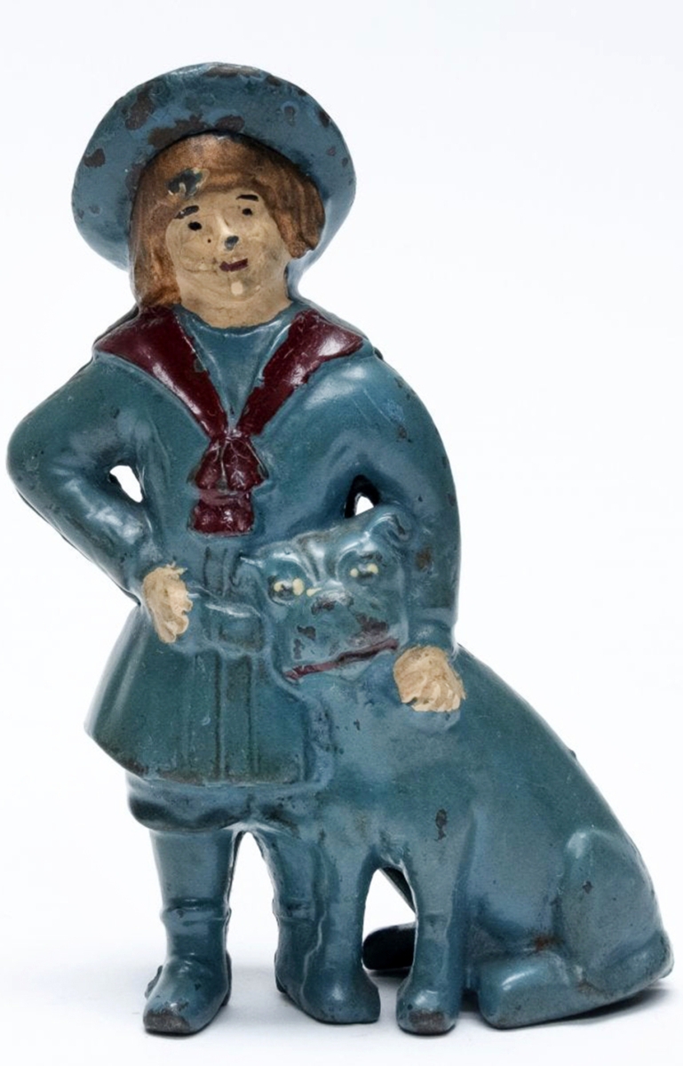 The auction concluded with a collection of mechanical banks, including Chief Big Moon Bank, another J&E Stevens, circa 1899, that sold for $4,500, just shy of the high estimate. Charles Bailey’s inspiration for “Chief Big Moon” may have come from the Frog Pond adjacent to the Stevens Foundry building. Punch & Judy (large letters) is a product of Shepard Hardware, Buffalo, N.Y., 1884, that sold for $3,900, within estimate. This bank of cast iron is in pristine condition. A few lots later, Cat and Mouse, by Stevens, in excellent-plus condition sold for $3,480, just short of the low estimate.