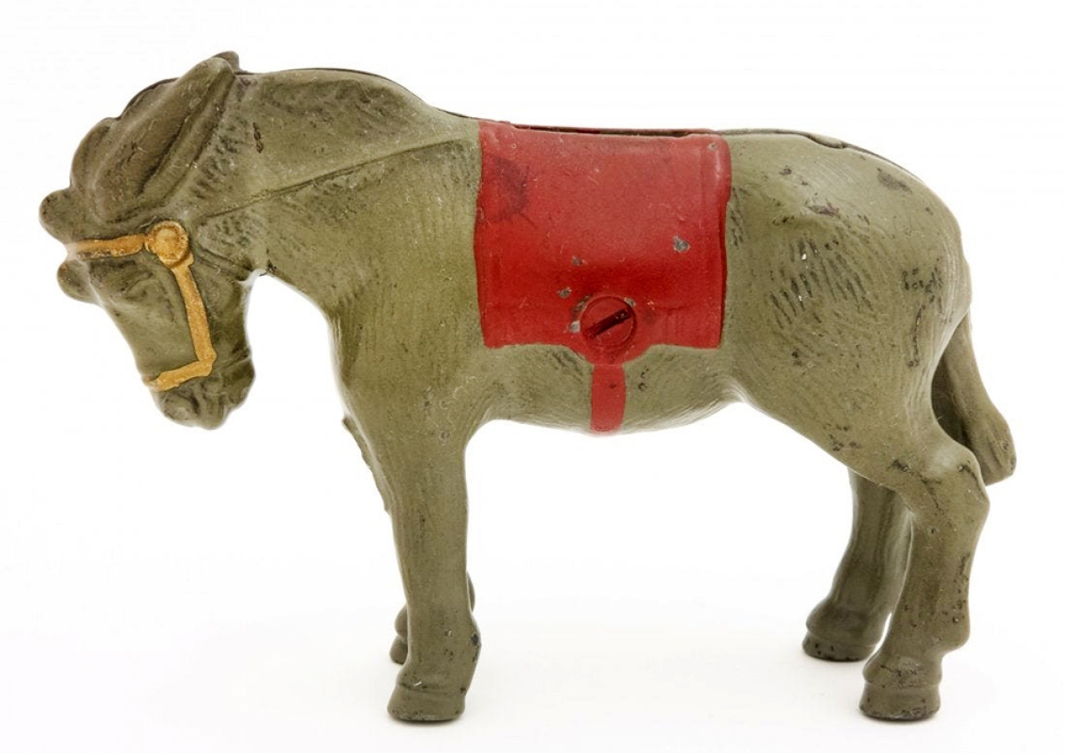 Another new bank to the gallery is a Long Horn Bull, American, 1910, and 4¼ inches long. The bank is cast iron, excellent-plus, and sold over estimate for $600. Elephant with Blanket, Kenton Hardware, Kenton, Ohio, 1936, was in fine condition and sold over estimate at $1,200. One of the popular spelter banks was the Seated Donkey, Germany, 1920, that sold over the estimate for $840.