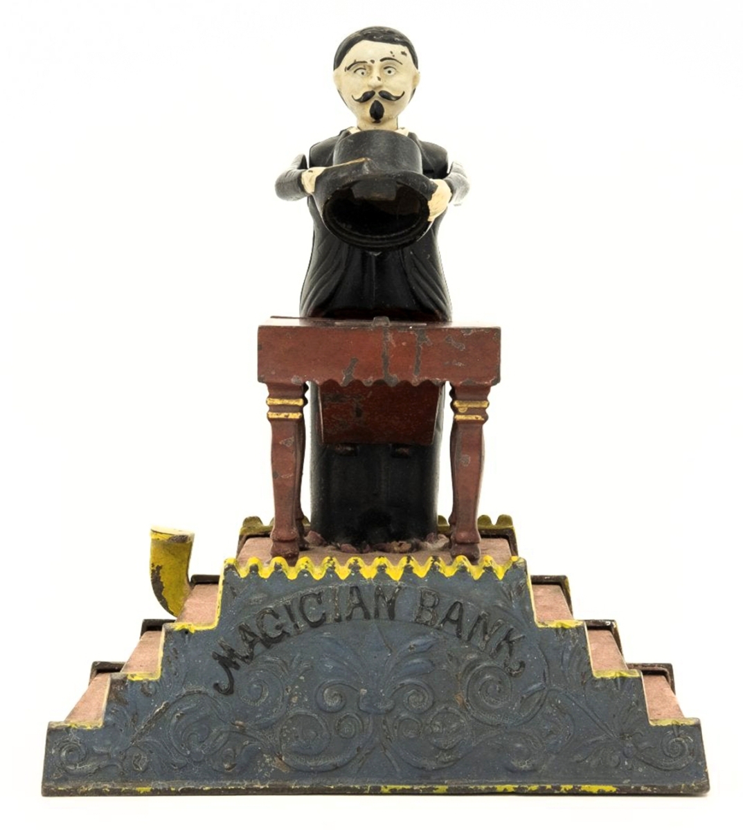 The two-day sale had a total of 884 lots, including still banks, mechanical banks, toys of many makes and items of folk art. In the end the total sum was $797,200, including the buyer’s premium. Buyers on the internet ended up with 23 percent of the lots, which constituted 11 percent of the total sum. “The antique bank and toy market is strong for items that are colorful and in excellent to superior condition,” said Leon.