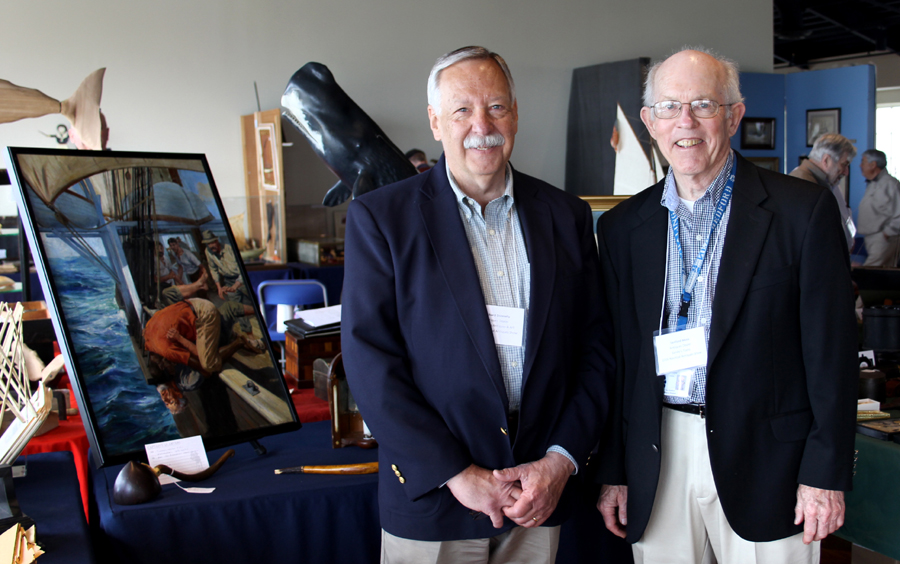 Dealers Richard Donnelly and Sandy Moss coordinate the Nautical Antiques Show, the prequel to Scrimshaw Weekend. The painting, left, belongs to Justin Cobb of Captain’s Quarters, Amherst, Mass.