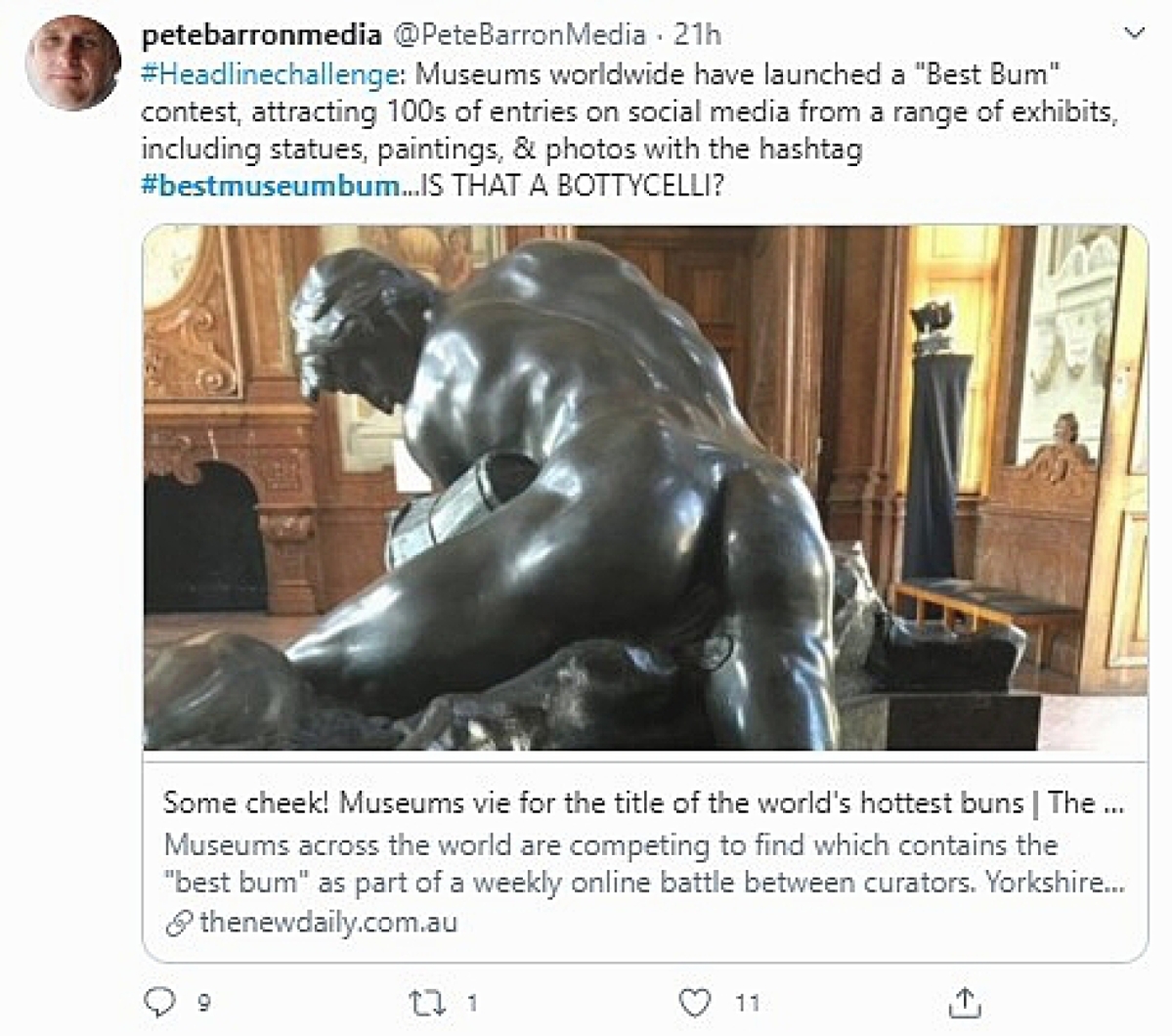 ONLINE – Curators around the world, whether working from home or at their institutional offices, have taken the opportunity of the COVID-19 pandemic to showcase items from their museums’ collections on Twitter following a number of different themes. These #CuratorBattles have focused on different topics, including asking who has the creepiest works or inviting viewers to recreate famous works. The latest iteration of this creativity focuses on more, um, different assets and was kicked off on June 26, when the Yorkshire Museum in York, England, threw down the gauntlet with #BestMuseumBum.