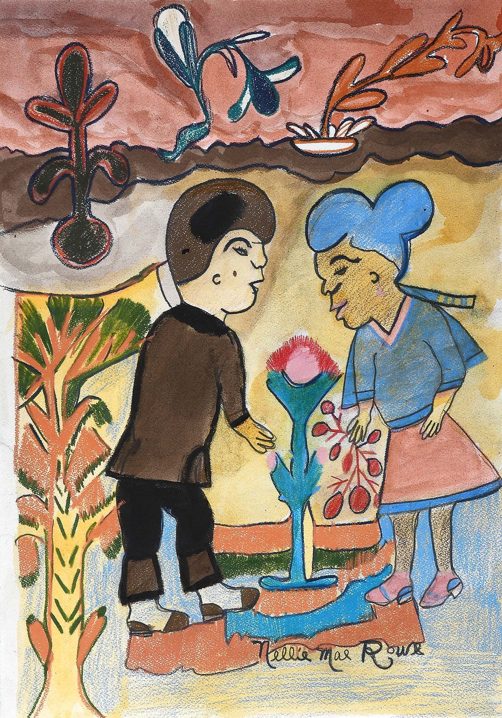 Nellie Mae Rowe’s (Georgia, 1900-1982) “Boy and Girl Admiring Rose Bush,” circa 1980-81, watercolor and crayon on paper, 25 by 20 inches framed, bloomed to $33,750 ($8/12,000).