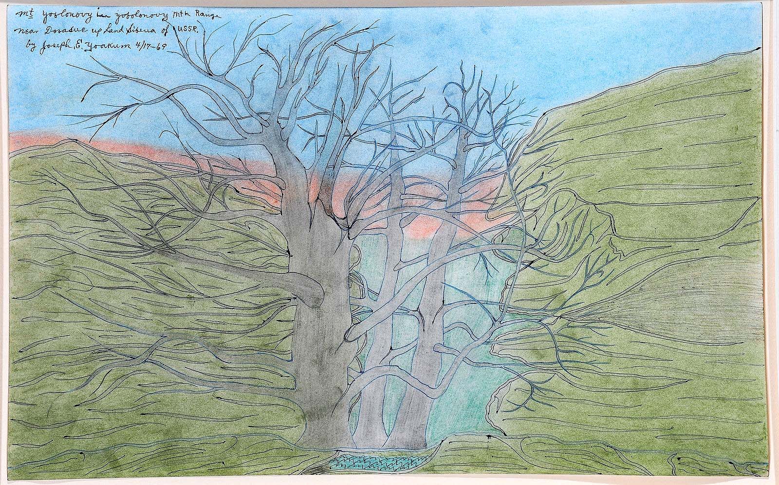 “Mt Yayblonvy in Yayblonvy Mtn Range Near Dorasue Upland of Siberia of USSR” by Joseph Yoakum (1891-1972), 1969, pastel, color pencil and ink on paper, 12 by 19 inches, surpassed its $8/12,000 estimate to make $21,875.