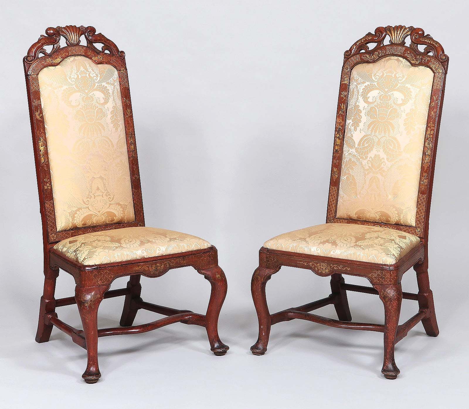 This pair of side chairs consigned by the Phipps family of Long Island, N.Y., had red lacquer frames with carved and gilt-painted chinoiserie scenes and were bid to $9,516 ($250/450).