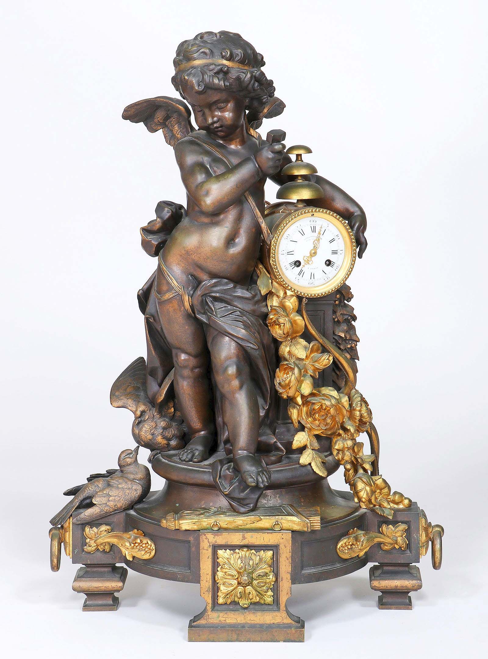A 29½-inch-high figural Cupid mantle clock by Victor Paillard led the decorative arts at $7,320. The Nineteenth Century patinated bronze clock was made in Paris and depicted Cupid holding a mallet and drum. The clock, which was embedded into the drum, had a dial marked “Victor Paillard, Ft de Bronzes, A Paris” in a cartouche.
