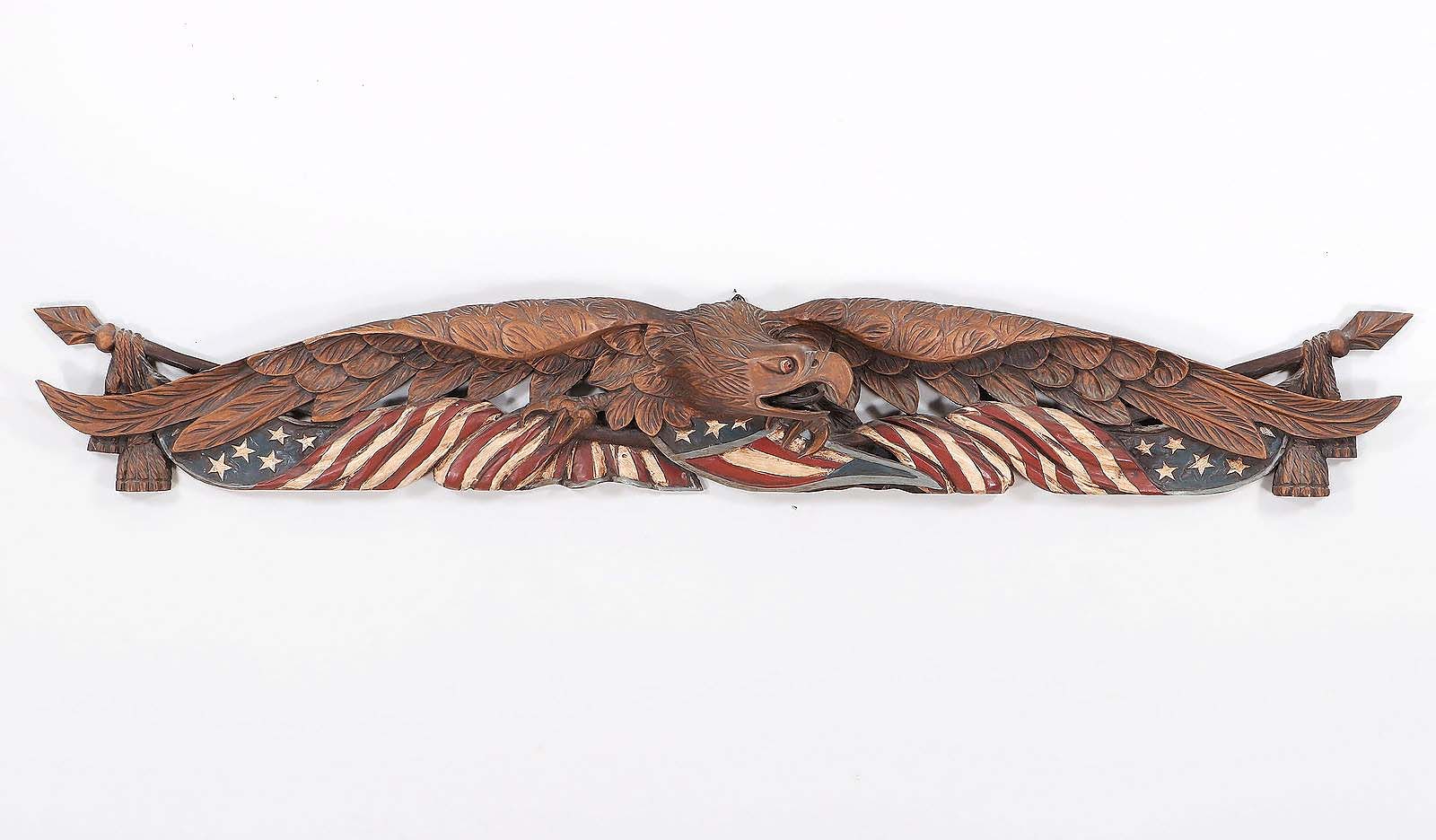 Eagles seemed to be a popular theme, with two carved and painted wooden eagle-form objects earning high prices. The first was a stern board by Maine-based artist Peter Q. Libbey, which soared to $6,832. The spread-winged eagle was clutching several American flags in its talons and had a wingspan of 58 inches. It was followed closely behind at $5,125 by an unattributed carved eagle ship’s figurehead, which still had original polychrome and gilt remnants.