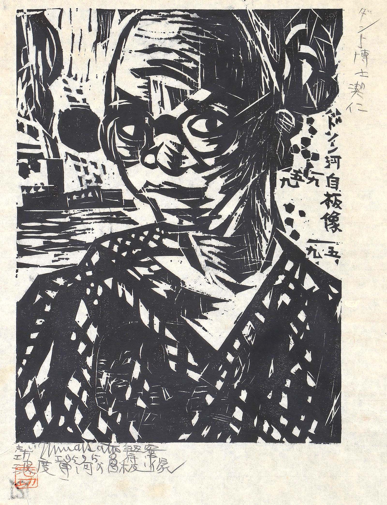 A gift from the artist to Arthur C. Danto, “Self-Portrait with Boat on the Hudson River” by Shiko Munakata (Japanese, 1903-1975), 1959, woodcut on rice paper, 24¾ by 20¼ inches framed, was bid to $4,758 ($1/2,000).