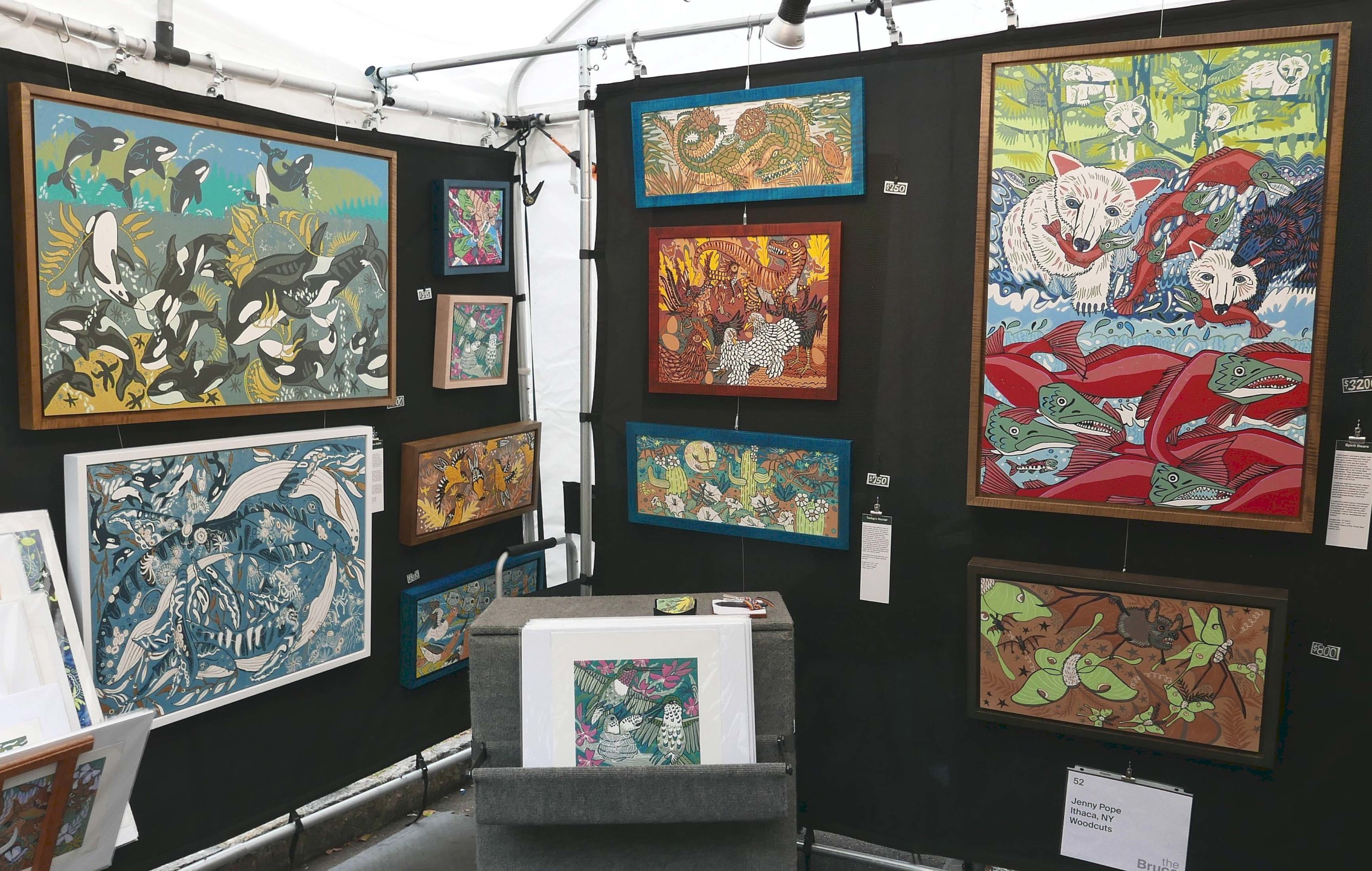 If you love animals but sculptures aren’t your thing, Bruce Franklin’s booth was just around the corner. Franklin, from Massapequa Park, N.Y., is a wildlife photographer whose striking aluminum prints captured the attention of showgoers of all ages. His first sale of the day was to a young girl who rifled through his photos, not stopping until she found one of her favorite animal: an elephant. Franklin has been attending this show for 10 years, reporting that he sells to a diverse clientele and does well here. When asked his favorite locations to shoot, he shared, “I’ve fallen in love with Iceland, so I’m back-and-forth a lot now.” As a result, he had a great selection of pictures of Icelandic horses. Others included leopards, orangutans, tigers, turtles, parrots and dolphins.