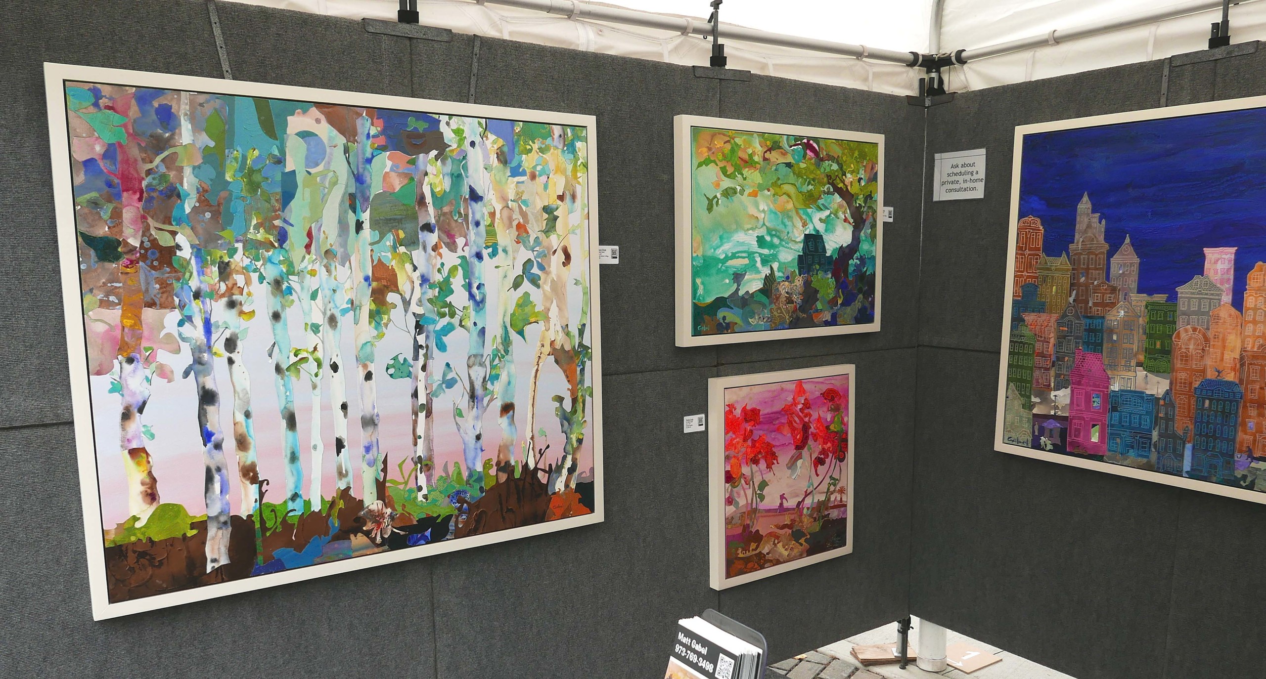 Matt Gabel of West Milford, N.J., was awarded First Prize for his vibrant mixed media compositions. The large tree scene to the left, “Sunset Float,” and “Honey Dew,” at the top, were both done this year.