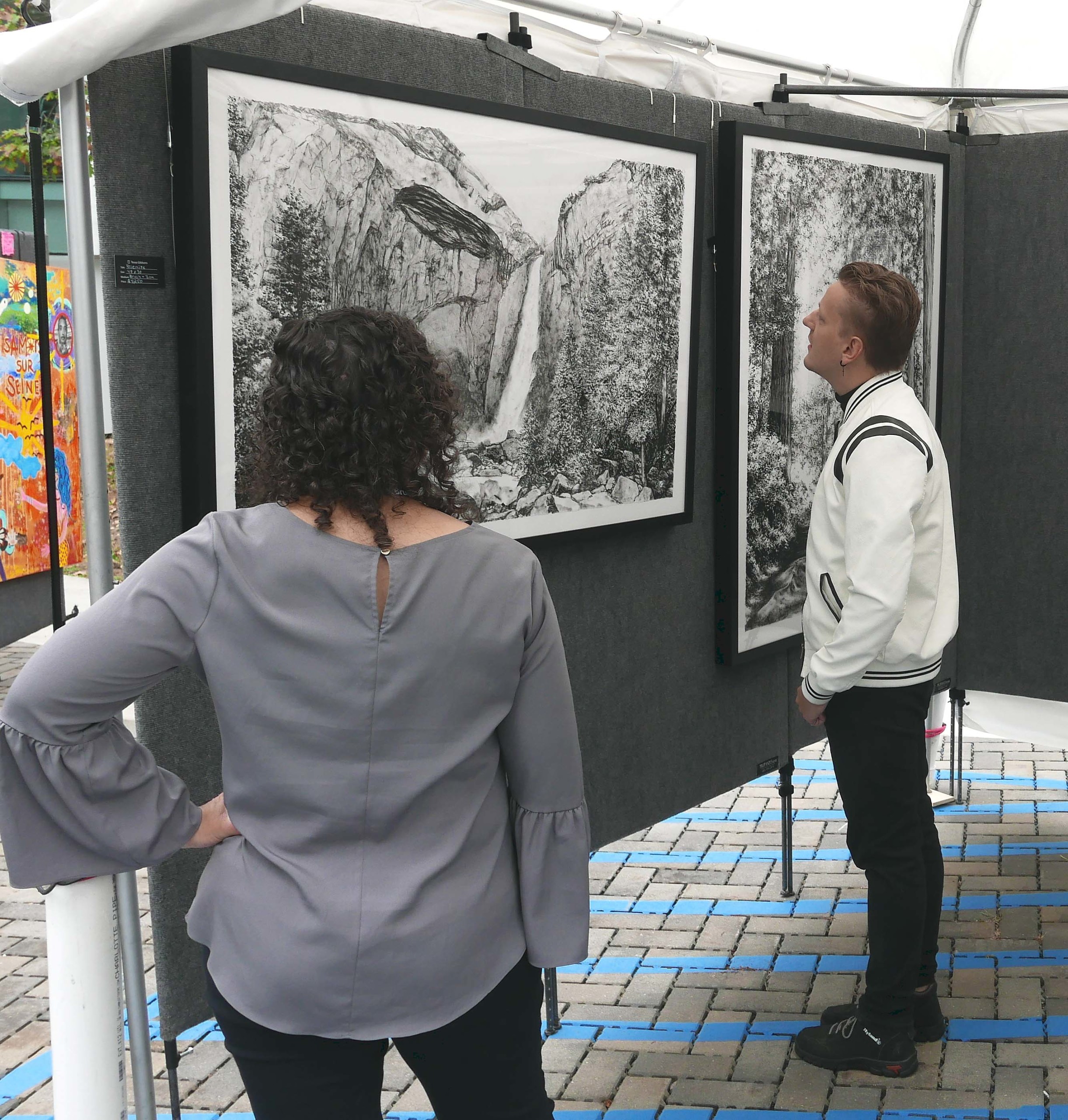 Gibbons, who was at the show for just her second time, brought several imposing landscapes with scenes and subjects to match. “Yosemite,” measuring 30 by 48 inches, depicted one of the park’s grand waterfalls, while others, such as “Rising Path,” depicted a lush wooded trail with tall trees and showed exceptional depth created with just brush and ink. She had a great first show last year and came back because “the quality is really great at this show, and the organizers are awesome. It’s the last show of the season for me — I like to end on a high note and this is it.”