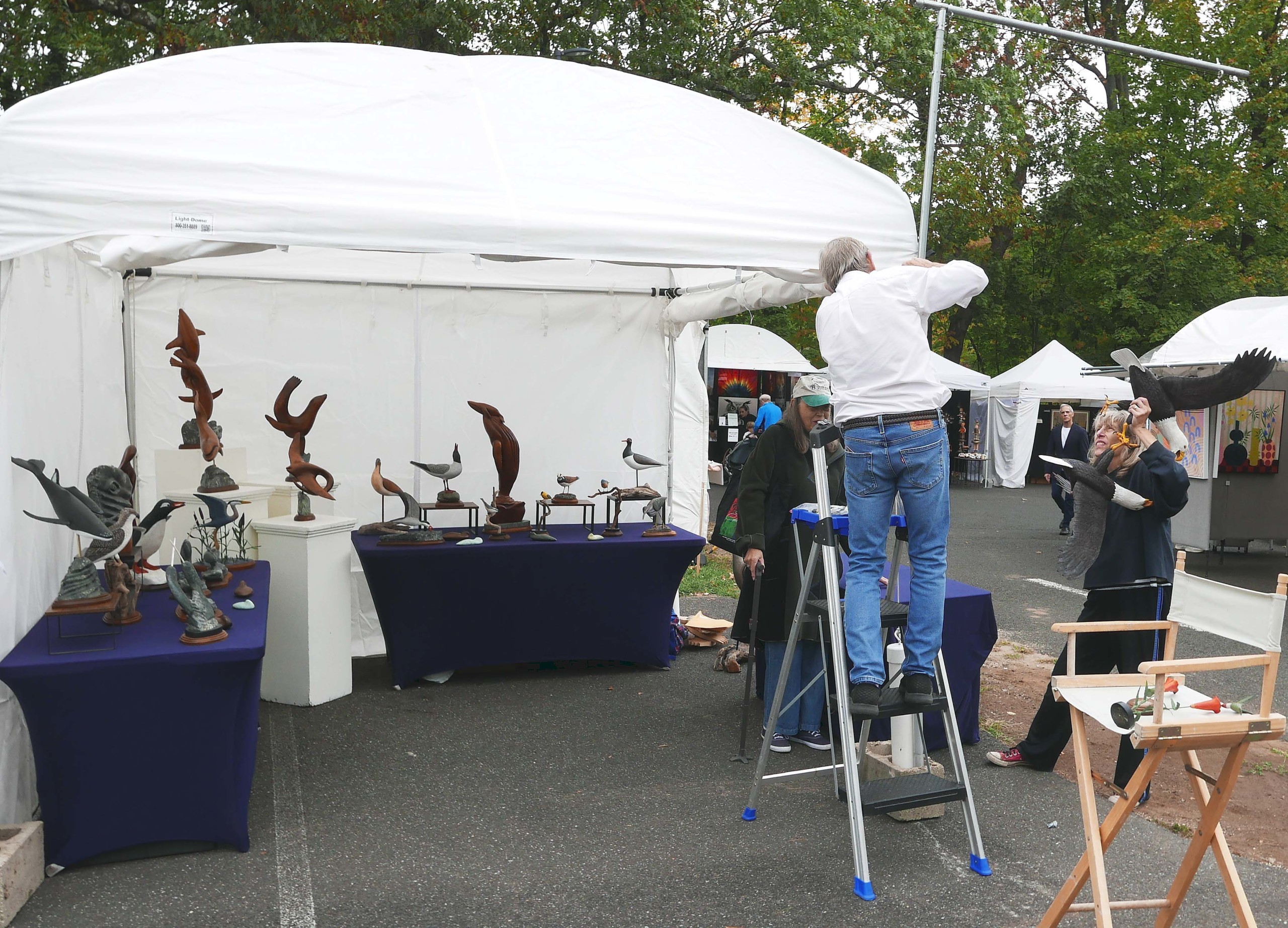 Peter Bowe is a wildlife sculptor who specializes in birds and marine mammals and has been showing at the Outdoor Arts Festival “for maybe 20 years.” Based in Stratford, Conn., Bowe has great opportunities to see some of his favorite subjects along the Connecticut shoreline. Previously a scientist — surprisingly not a naturalist — Bowe shared, “I have always loved shorebird decoys — I’ve collected them since I was a young boy — and I love marine mammals, so that’s what I make!” He uses wood, bronze and stone to create his representational bird carvings, traditional decoys and stylized realism sculptures. His most recent work on display was a pair of bald eagles with interlocked talons in the “cartwheeling” mating ritual. While most of his works were affixed to solid bases, the eagles were suspended outside his booth.