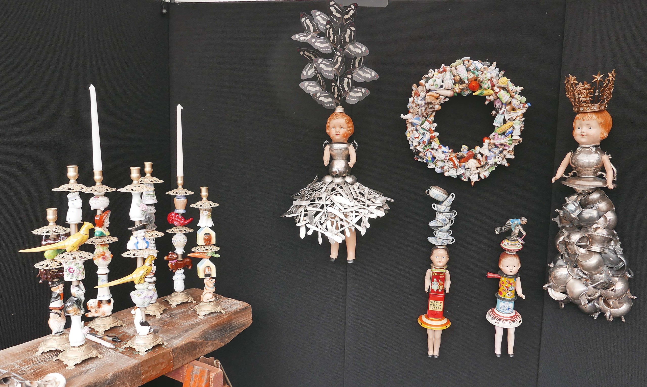 Another artform that seemed to be popular with shoppers was assemblage and collage. Several artists reported using found objects to create their works. One, William Finks, collects antique objects and crafts sculptures and other decorative objects out of them. One example, which the Albany, N.Y., artist had sold shortly after the show opened, was an antique doll head and arms mounted to a body made of vintage and antique silver items, including bowls, cups, saucers and kettles. He also had a selection of candlesticks made with salt and pepper shakers that were quite popular with shoppers. “I always love this show because the people who run it are wonderful,” he noted.