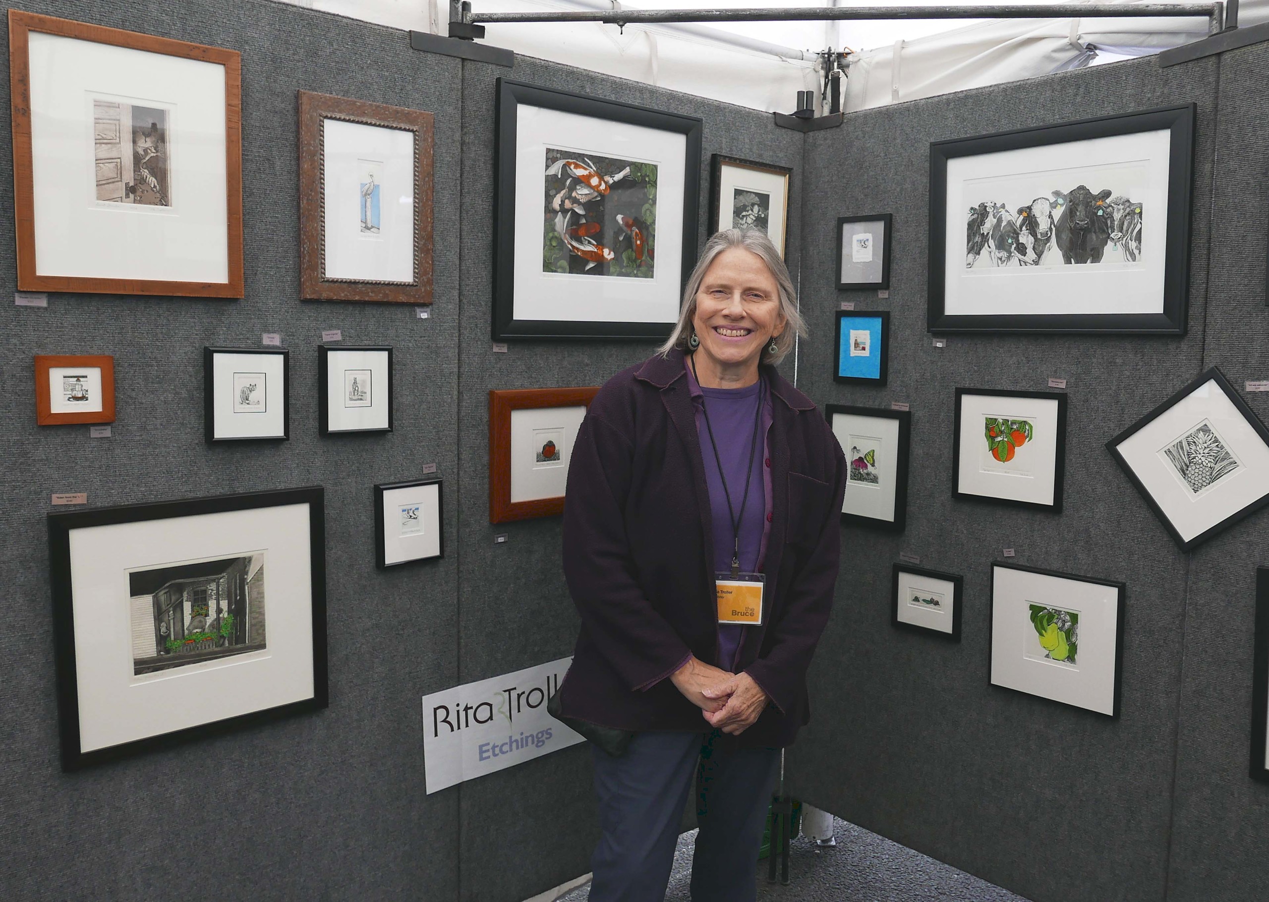 While the show honors art of all media, Gordon reported that “Printmaking was very strong. Perhaps due to the influence of CCP, Center for Contemporary Printmaking, in the area or new interest in mastering the traditional artform.” The class of exhibiting printmakers included Rita Troller, Jenny Pope, Gali Katz, Matthew Brown, Tokoha Matsuda and Flo Kemp. Troller typically creates her works using traditional methods of acid etching, though she noted that she’s “starting to experiment” with other techniques. Her works are printed with oil-based inks and she accents them by hand with watercolors. “I’m from the Chicago area, but I like coming out to this show because they support all fine art, including printmaking, which is somewhat rare at shows,” she shared. A few of the prints she had in her booth, such as “Round Robin” and “Here ‘N Gone” were new, though she noted having several final editions, as she only makes 150 prints of each etching.