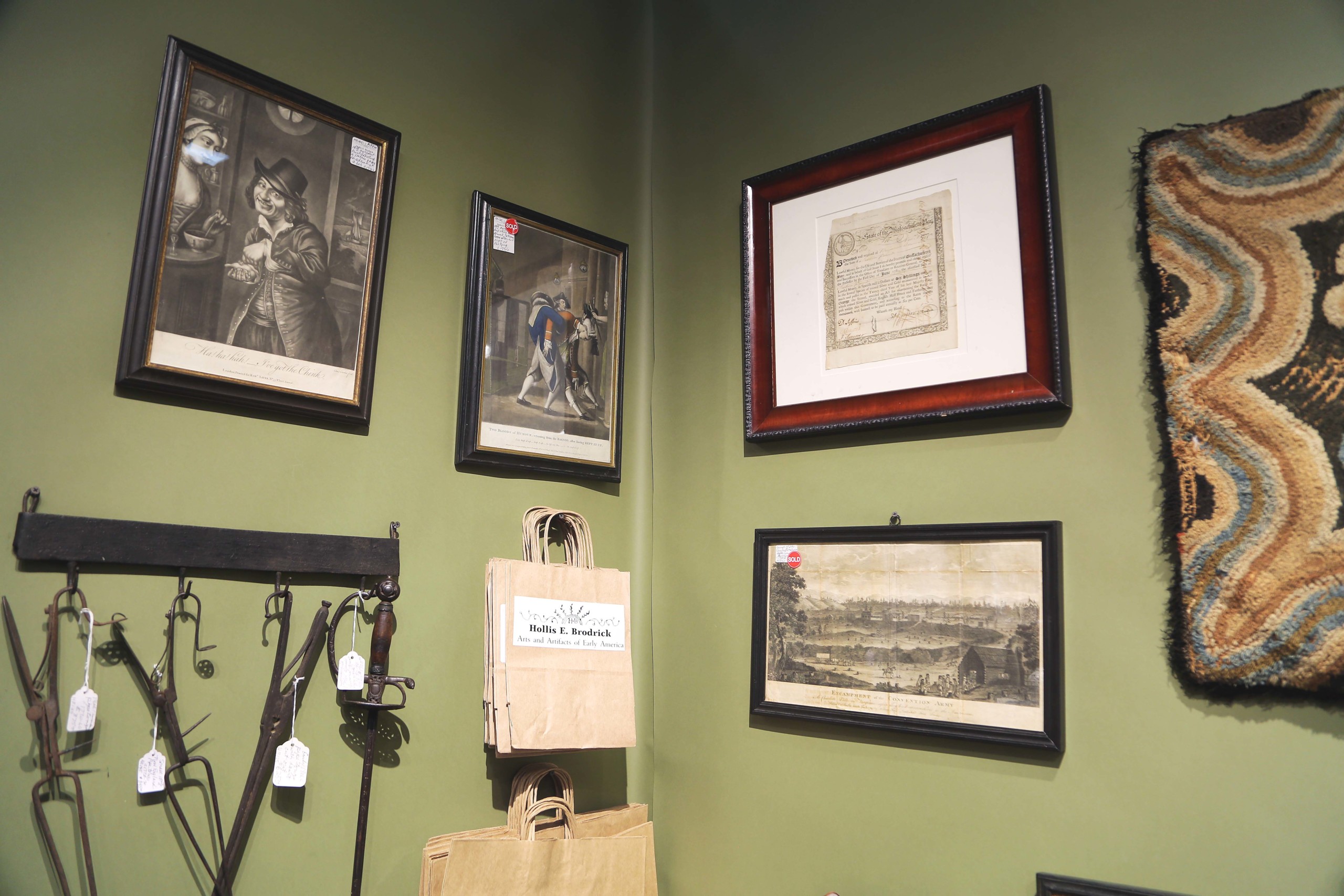 Hollis Brodrick and Brian Cullity shared a booth; the two have complimentary inventory, so their joint layout was visually seamless, save for different-colored papered walls. On opening night, Brodrick immediately sold a circa 1720 bannister-back chair from Bermuda and, by the end of opening night, a print of the encampment of the Continental Army and a pair of mezzotint prints were also sold.