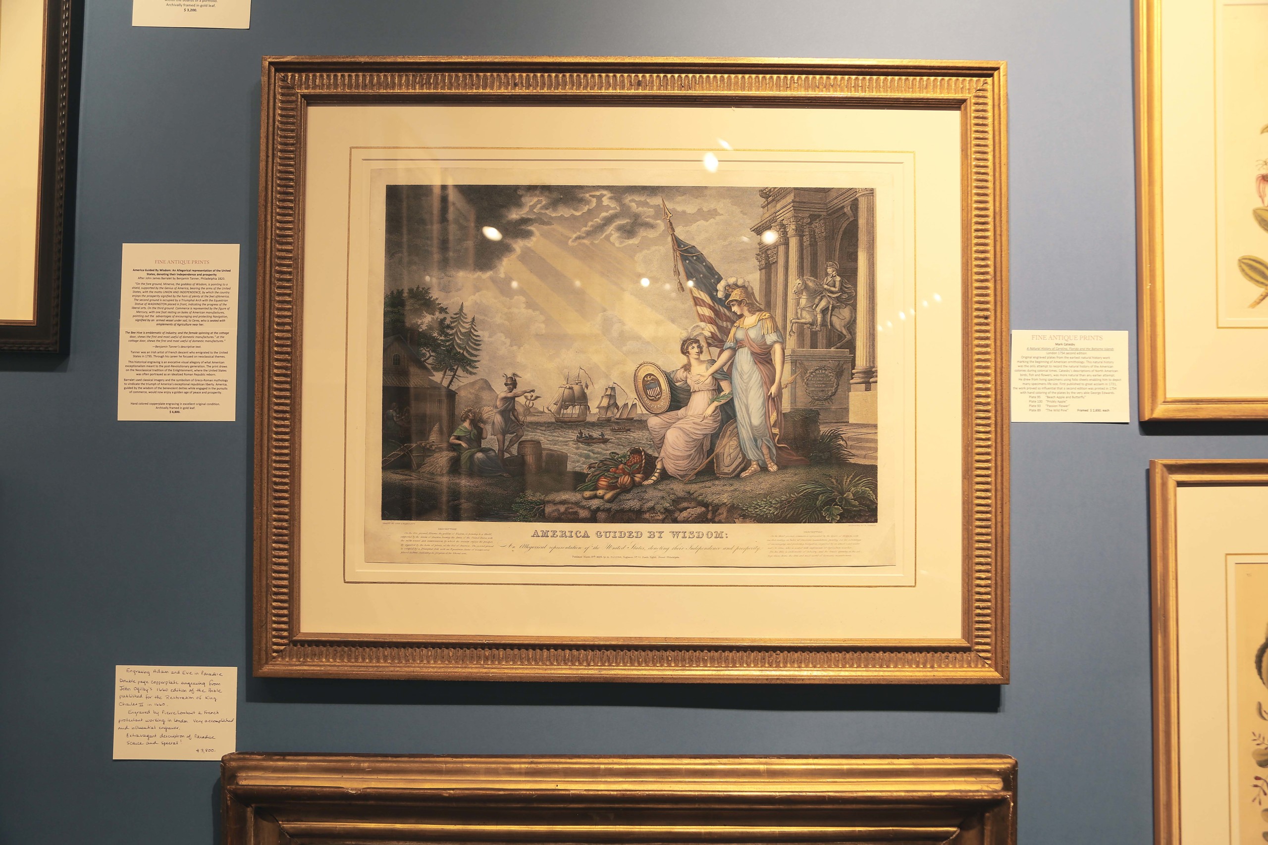 If one were compiling a list of patriotic pictures at the show, one would certainly need to include “America Guided by Wisdom,” which was a hand-colored copperplate engraving of an allegorical representation of the United States, after John James Barralet, by Benjamin Tanner and published in Philadelphia in 1820. Denise De Laurentis was thrilled to have it.