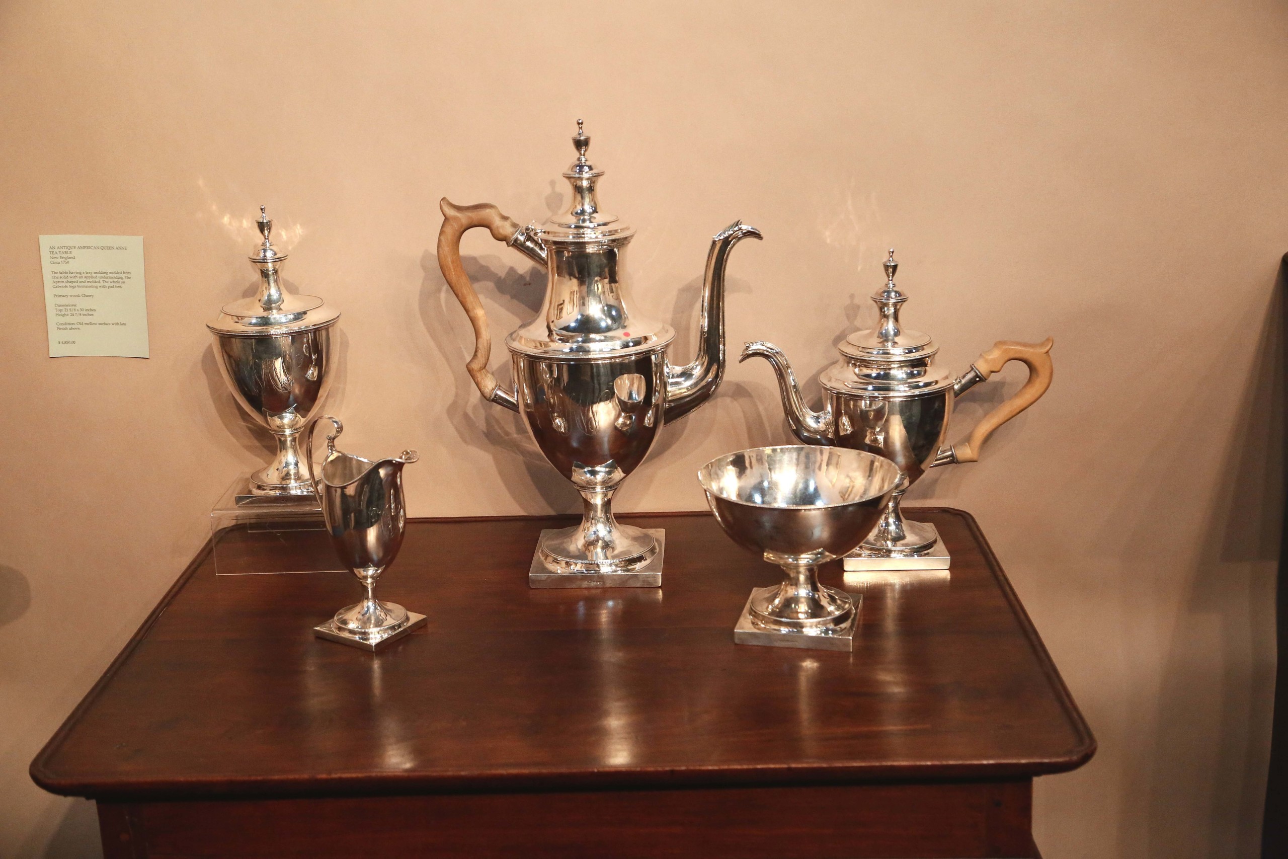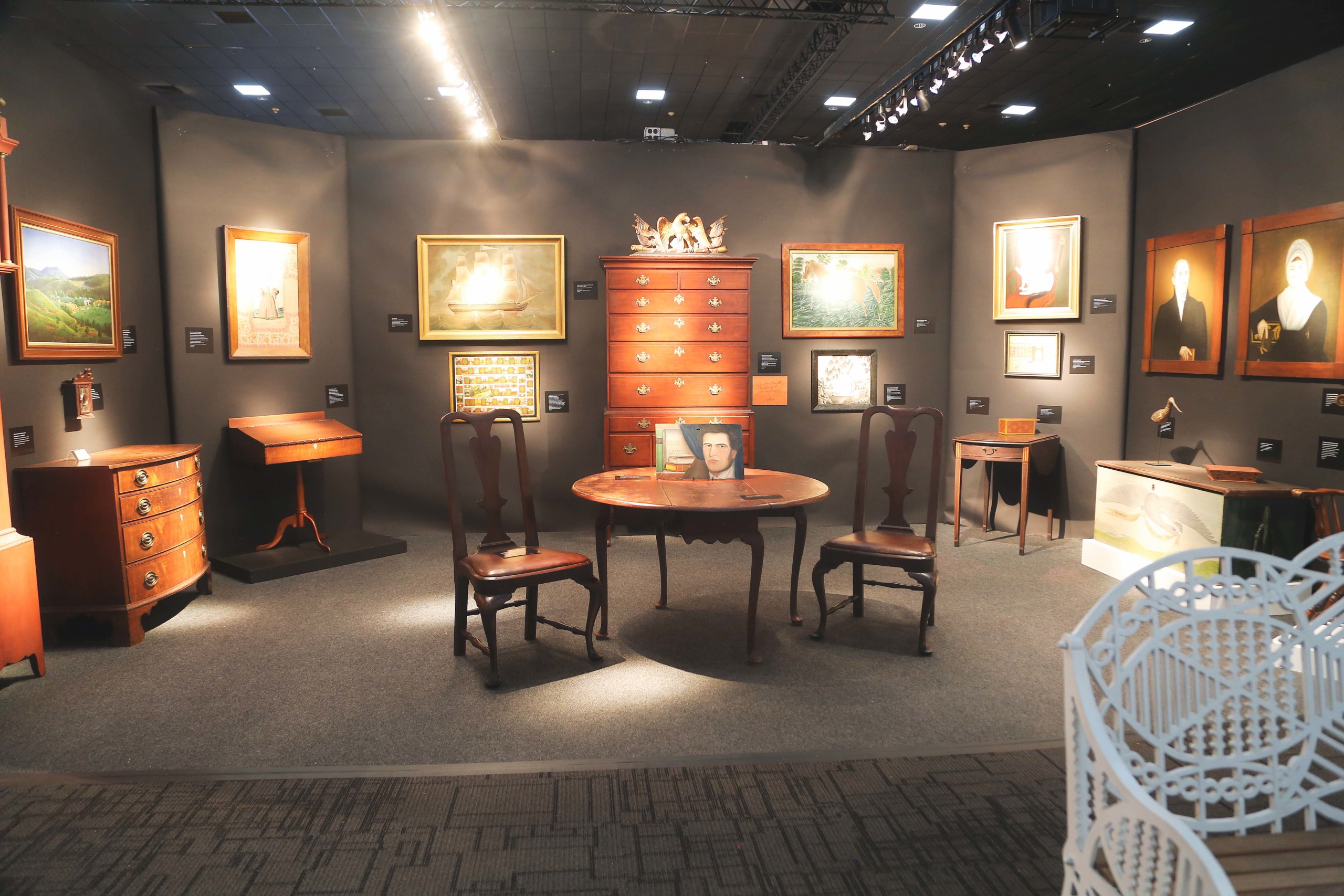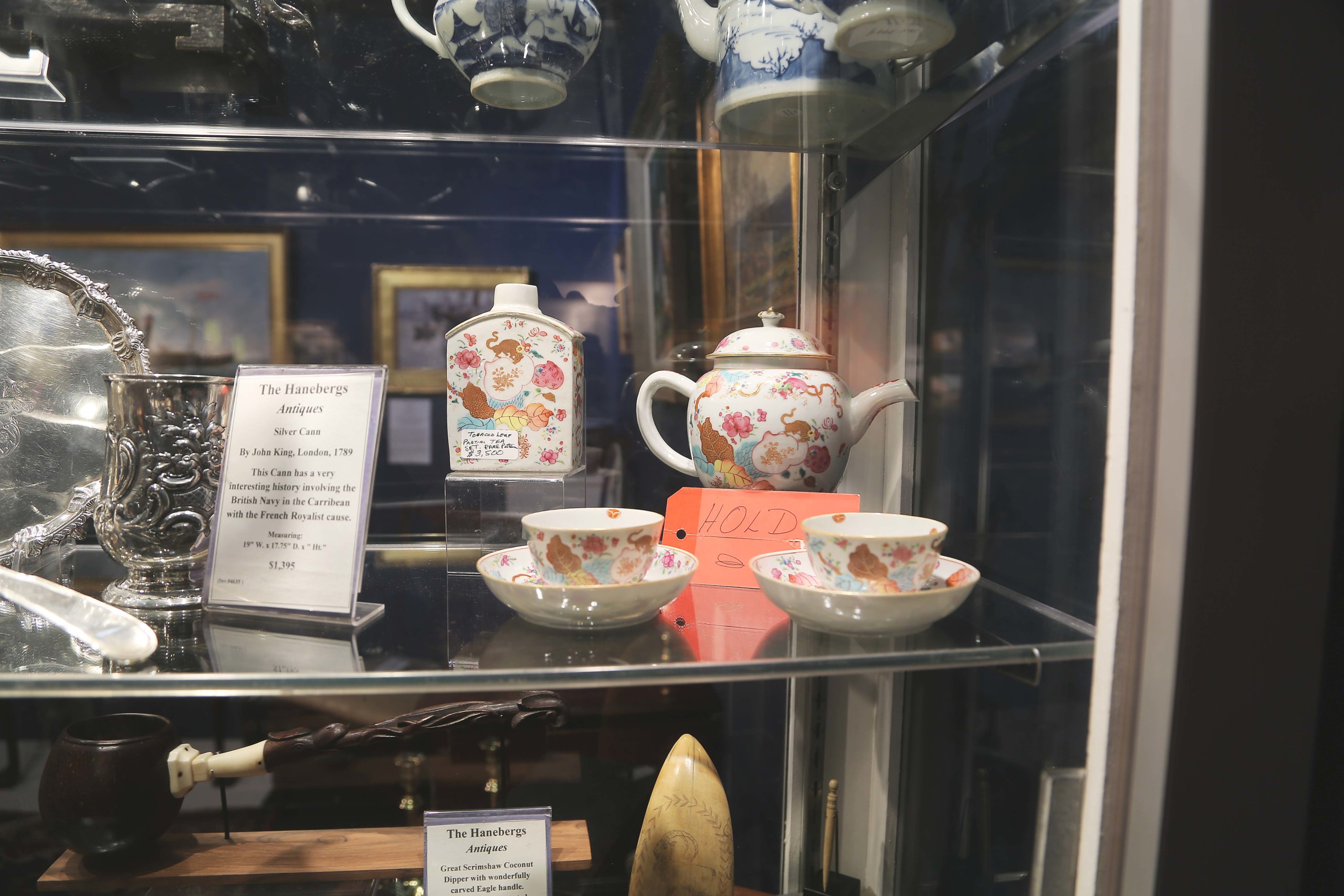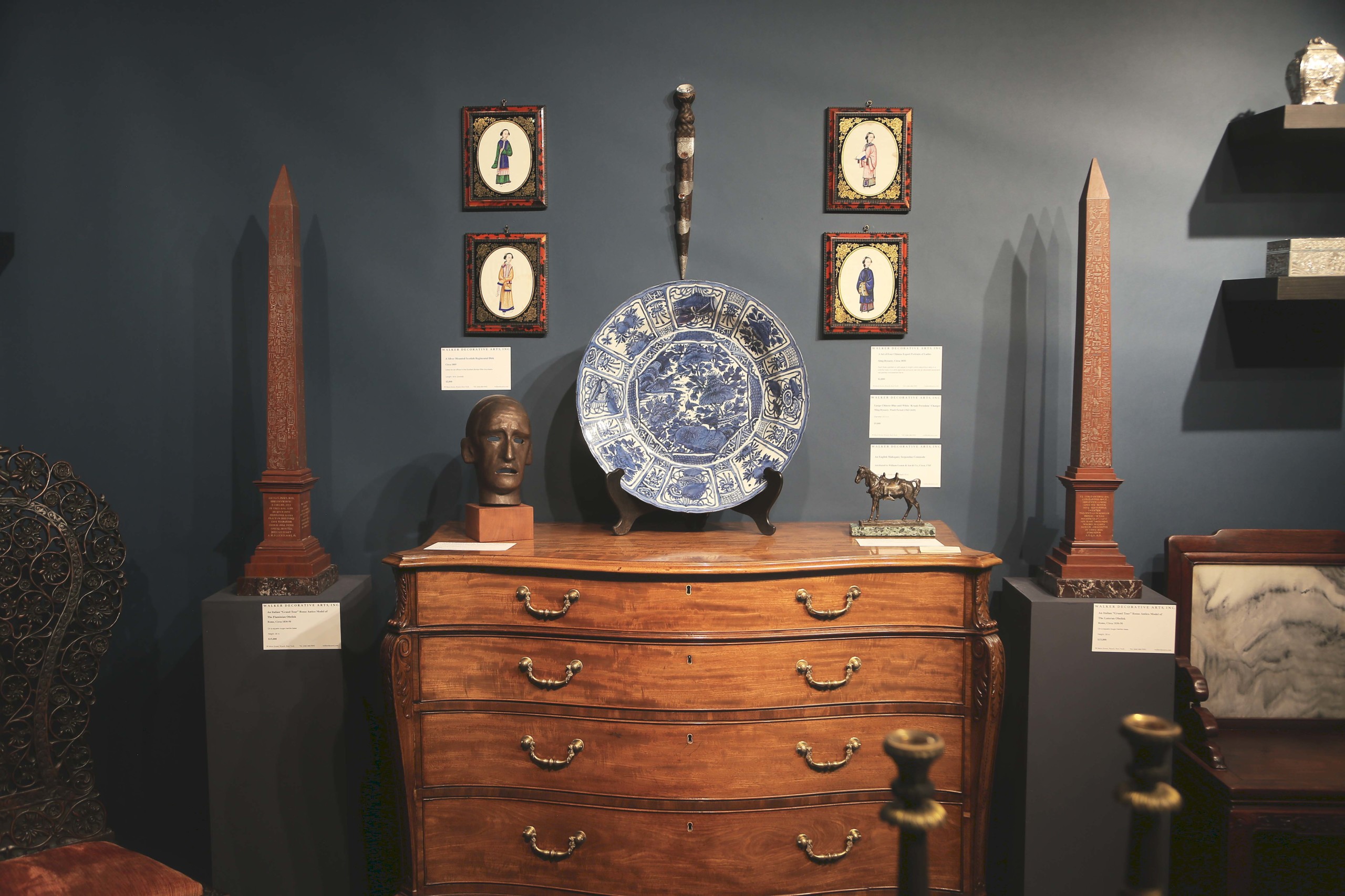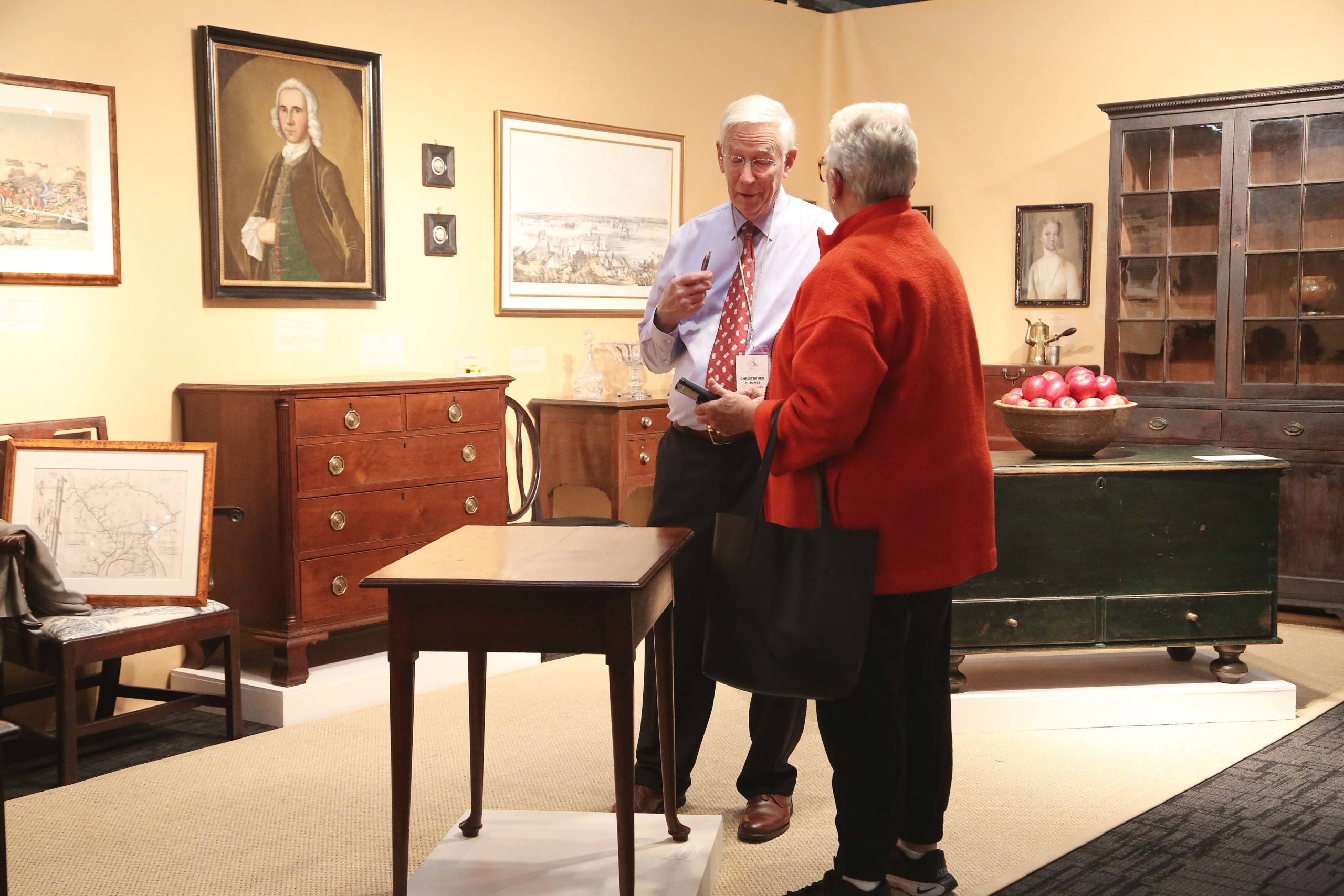 Frank Levy, showing near Sergeant, noted the event “is geographically very mixed and draws from all over.” He reported, “I saw a lot of people from New England there, as well as from Texas. It was a great show and I’m very happy; Winterthur does an incredible job.” He made several new connections, with sales to existing clients as well. Among his sales were a pair of miniature wax portraits, a late Federal campaign desk, a pair of unsigned portraits of a Black couple, a Chinese export lidded coffee pot, a powder horn engraved with the Siege of Boston, a miniature box on feet and a tambour basin stand attributed to John Seymour.