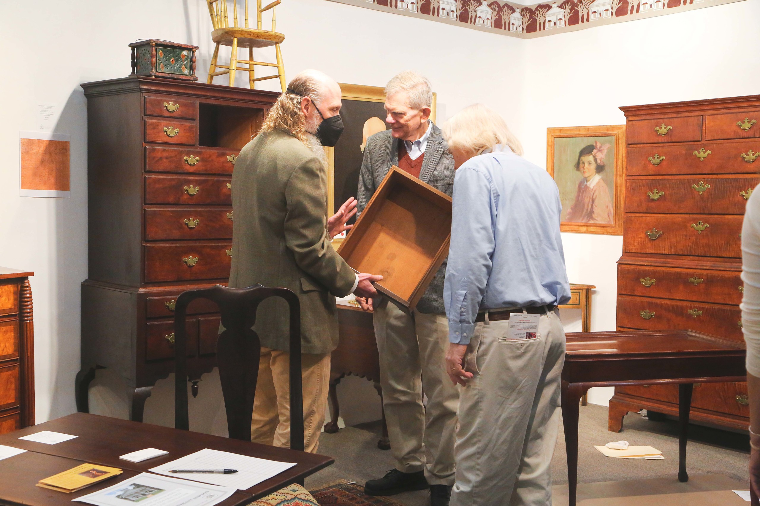 Winterthur’s presence and influence are felt throughout the show and the museum’s curators — both emeritus and active — could be spotted throughout the event. Here, Nathan Liverant associate Kevin Tulimieri (left) examined the drawer of a high chest signed by Elijah Loveland with Brock Jobe (center) and Greg Landry (right). Nathan Liverant and Son, Colchester, Conn.