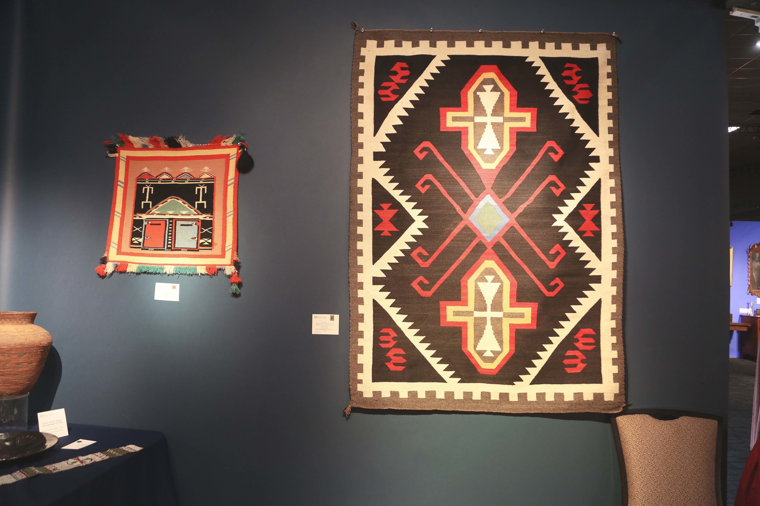 Native American art was in limited supply, but longtime specialist Marcy Burns brings a strong selection each year. For this edition, she was debuting two pieces from her personal collection: a Navajo (Diné) single Sunday saddle blanket with tableta images from the 1880s-90s and a Navajo (Diné) J.B. Moore Crystal rug with green and blue center, possibly the work of Bi-leen Al-pai-Bi-zha-ahd, circa early 1900s.