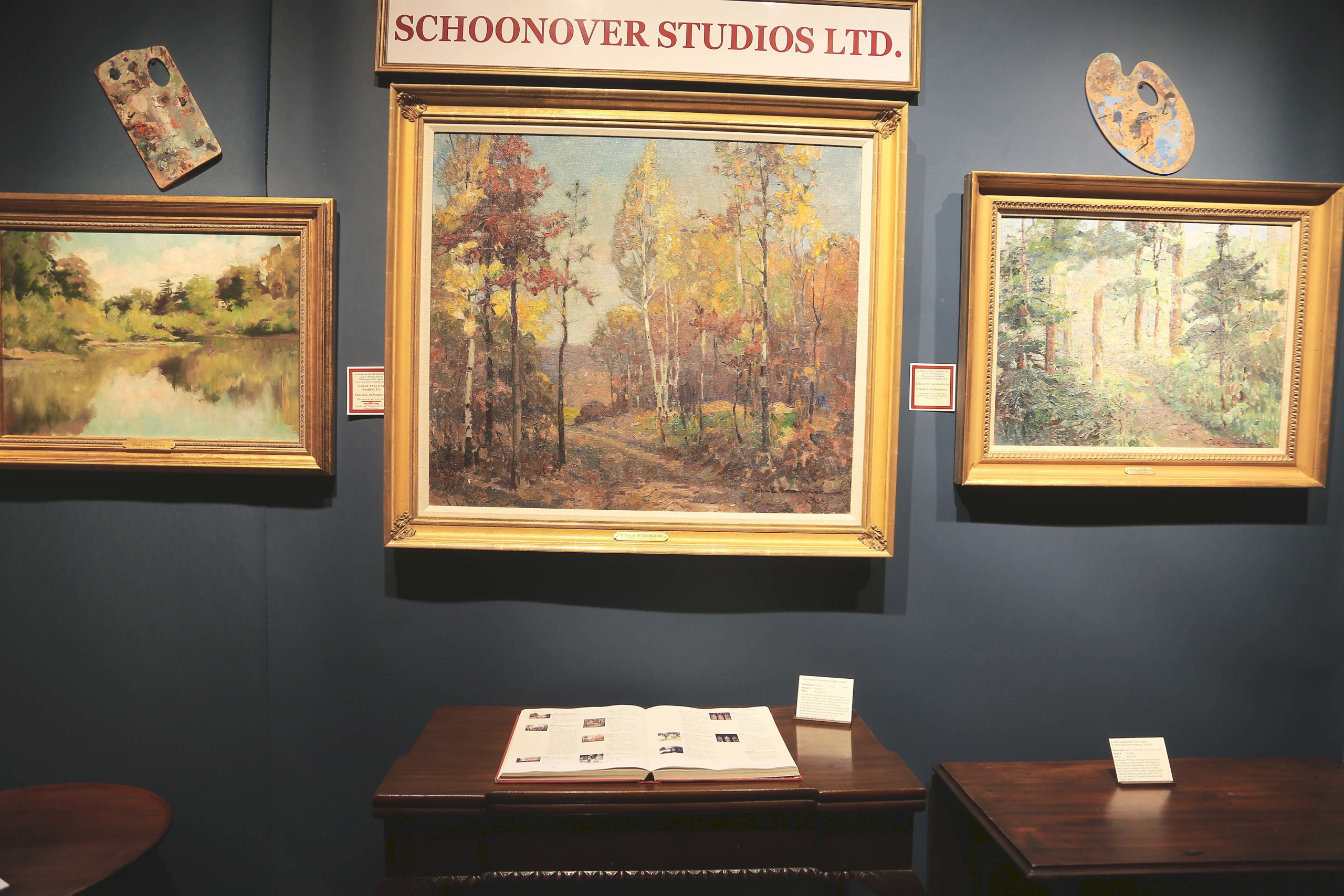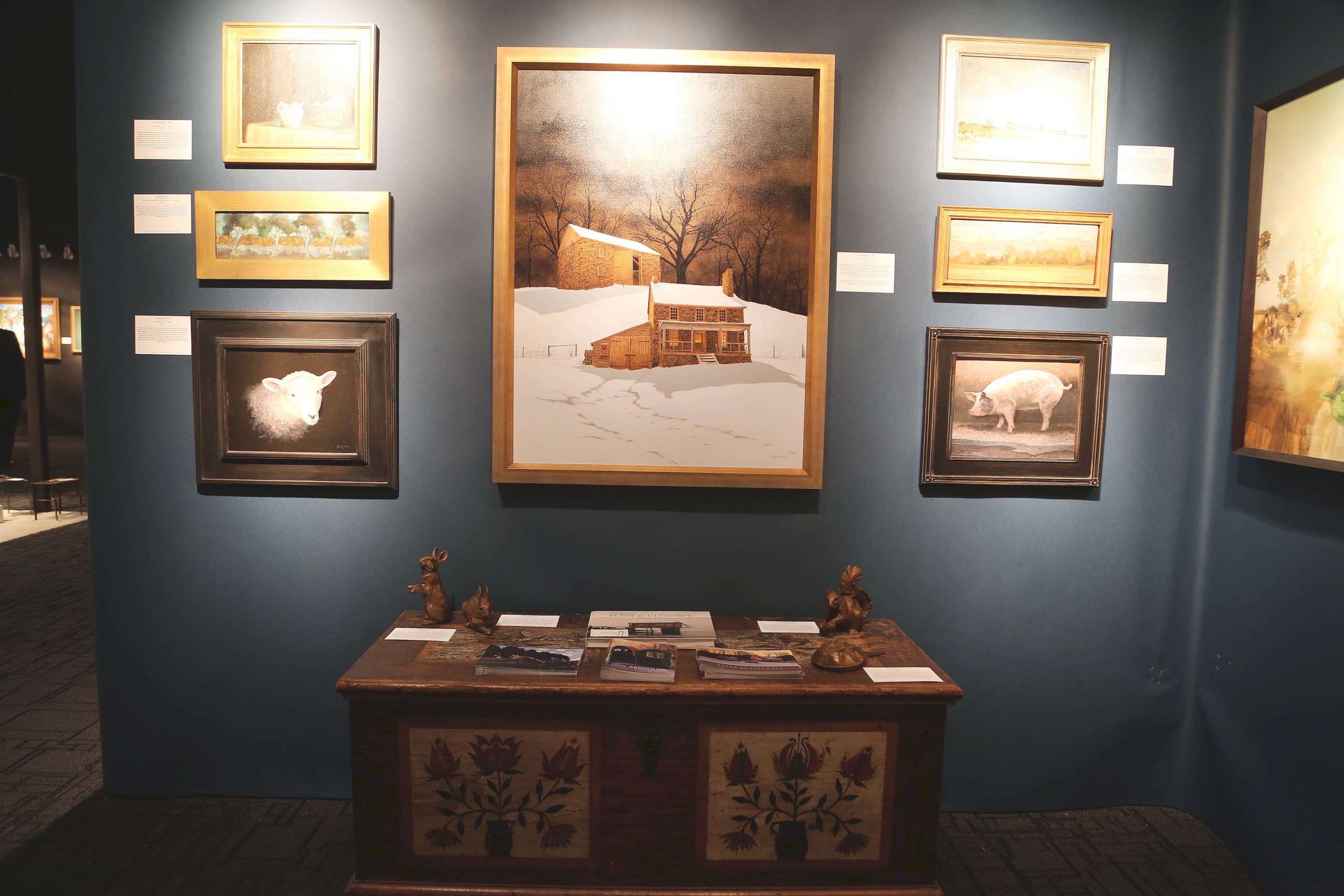 Schoonover Studios offered a good selection of Frank E. Schoonover’s work, including these three landscapes. From left, “Delaware River Near Trenton,” “A Real Fall Day” and “Across the Brandywine.” The second volume of Schoonover’s catalog raisonne was on the table below. Wilmington, Del.