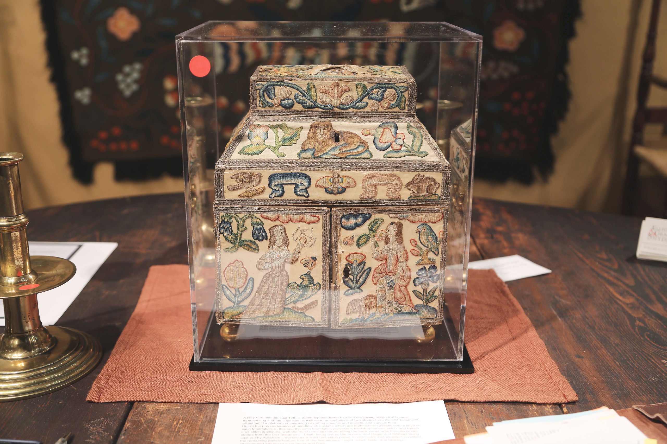 Across the aisle from Kilvington, Elliott and Grace Snyder were doing an equally robust business, with sales in every category. Among their sales were an important Seventeenth Century English casket, a piece of Seventeenth Century beadwork that sold to a museum, an hour glass, a pair of Spanish candlestands, an early candlestick with an Eighteenth Century miniature, an English slipware dish, an oval tea table, a lowboy, a Connecticut chair with a crest carved with a rose, a watercolor memorial that had been in the collection of Nina Fletcher Little and a historically important pair of trumpet candlesticks that had been at the Guild Hall in London. The Snyders’ target market is the educated connoisseur of early rarities rather than people shopping for “a look” and they meet that market in Delaware.