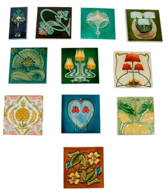 Collection Of (11) English Majolica Art Nouveau Era Floral Design Tiles