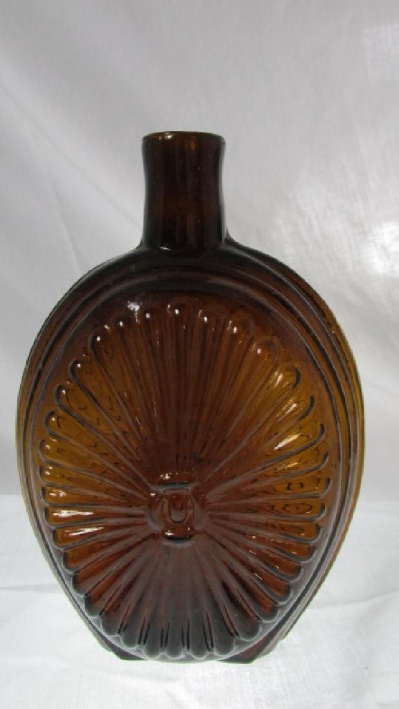 Dark amber family colored glass, center base pontil, 6¼ by 4¼ inches.