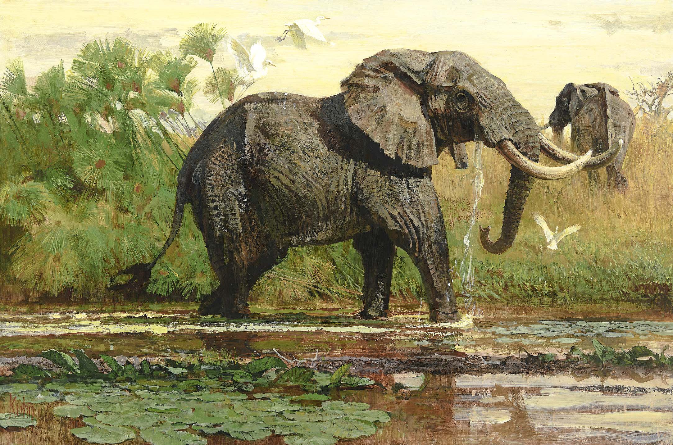 “Elephant in Papyrus” by Bob Kuhn (1920-2007), acrylic on board, 24 by 36 inches, rose to $108,900 ($60/90,000).
