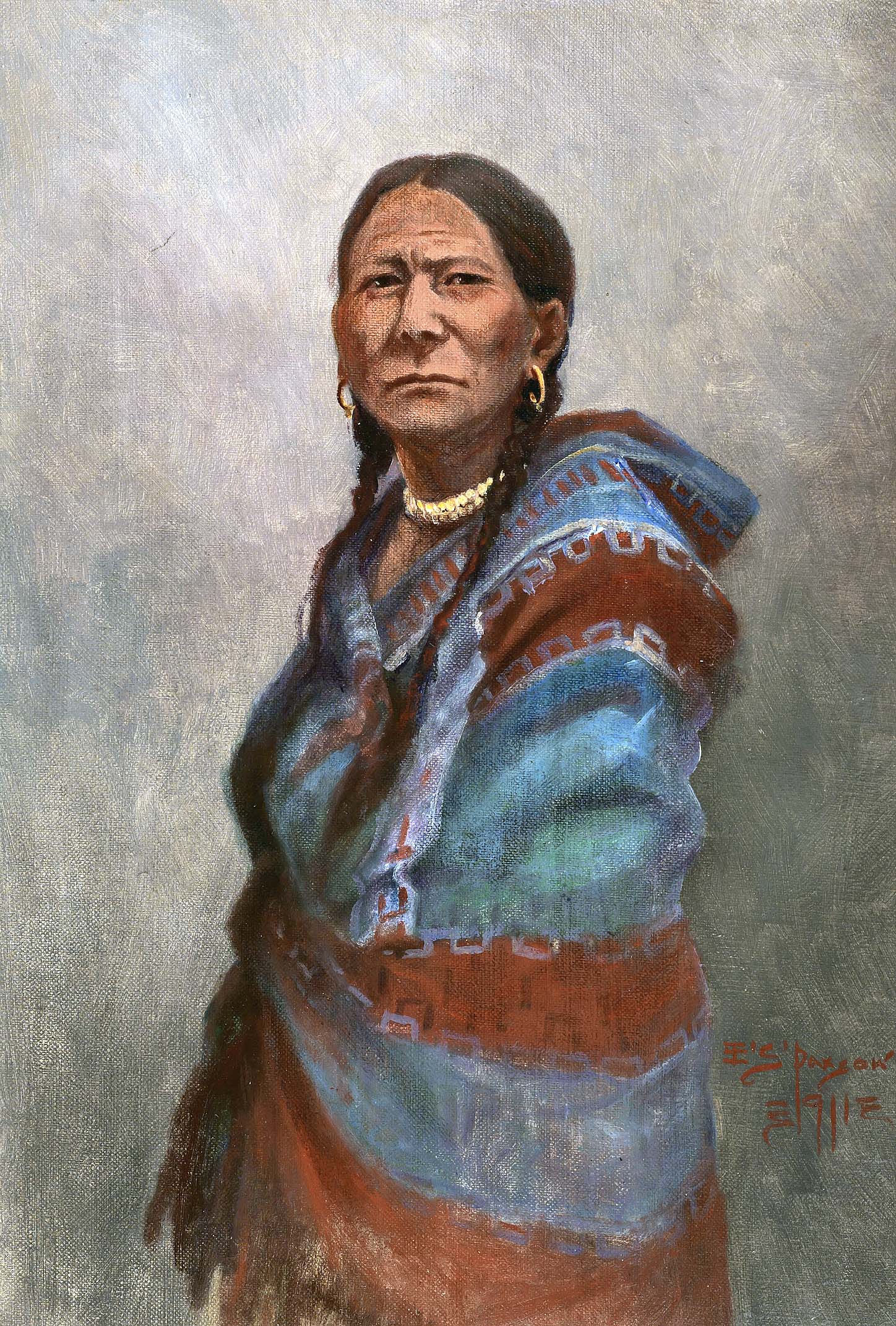 “Indian Woman with Colored Blanket” by Edgar S. Paxson (1852-1919), 1911, oil on canvas laid on board, 16 by 11 inches, brought $60,500 ($15/25,000).
