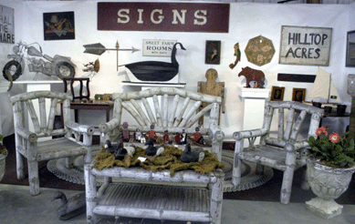 David Allan Ramsay, Cape Porpoise, Maine, and Lake Worth, Fla., offered a Victorian-style antique twig bench with two matching chairs. A matching table was attractively decorated with greenery and decoys, while the bench offered seating for a grouping of black dolls.