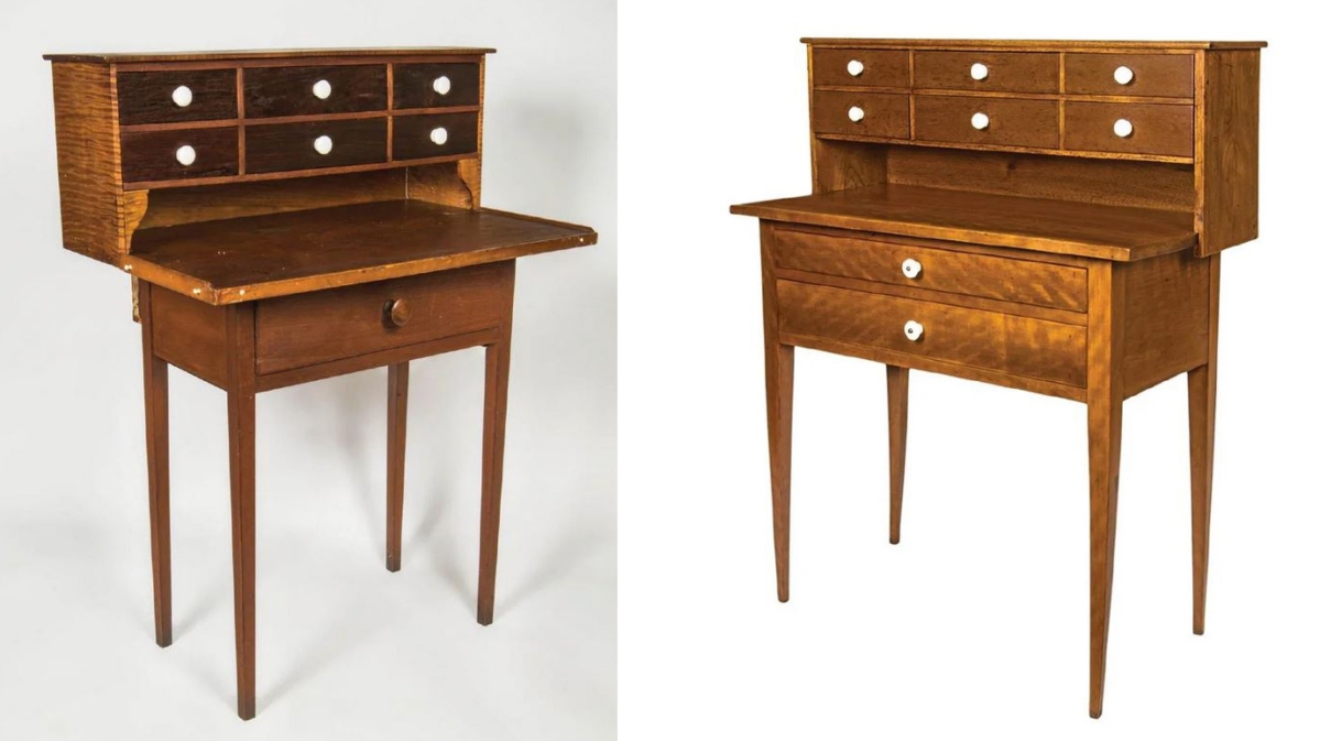 With the sewing cabinet adorning the back cover, the tiger maple sewing desk on the left was featured on the frontispiece, and the cherry example on the right on the cover. Both had add-ons of six drawers but that on the left was cataloged as being added about 30 years after its 1849 date of origin. Bottom Sections: left – 37½ by 27 by 17½ inches with a single drawer, framed top and small white porcelain pegs along the edge; right — 38½ by 30½ by 15¾ inches with two drawers and framed top. Prices were $6,765, left, and $22,755, right. In his 1988 sale 30 years ago, Henry sold a similar cherry desk with the add-on and two lower drawers for $12,650. The desk on the right was special because of the inscription “Adoline Cantral May 12 1874 OH” and “No 3” and No. 4” on the bottoms of the drawers in the upper section. OH is Orren Haskins from Hancock. A comparable signed desk is in the Hancock Shaker Museum collection but the top on this one was probably a later addition as can be seen by the difference in the dovetailing, a feature not seen in the Hancock example.