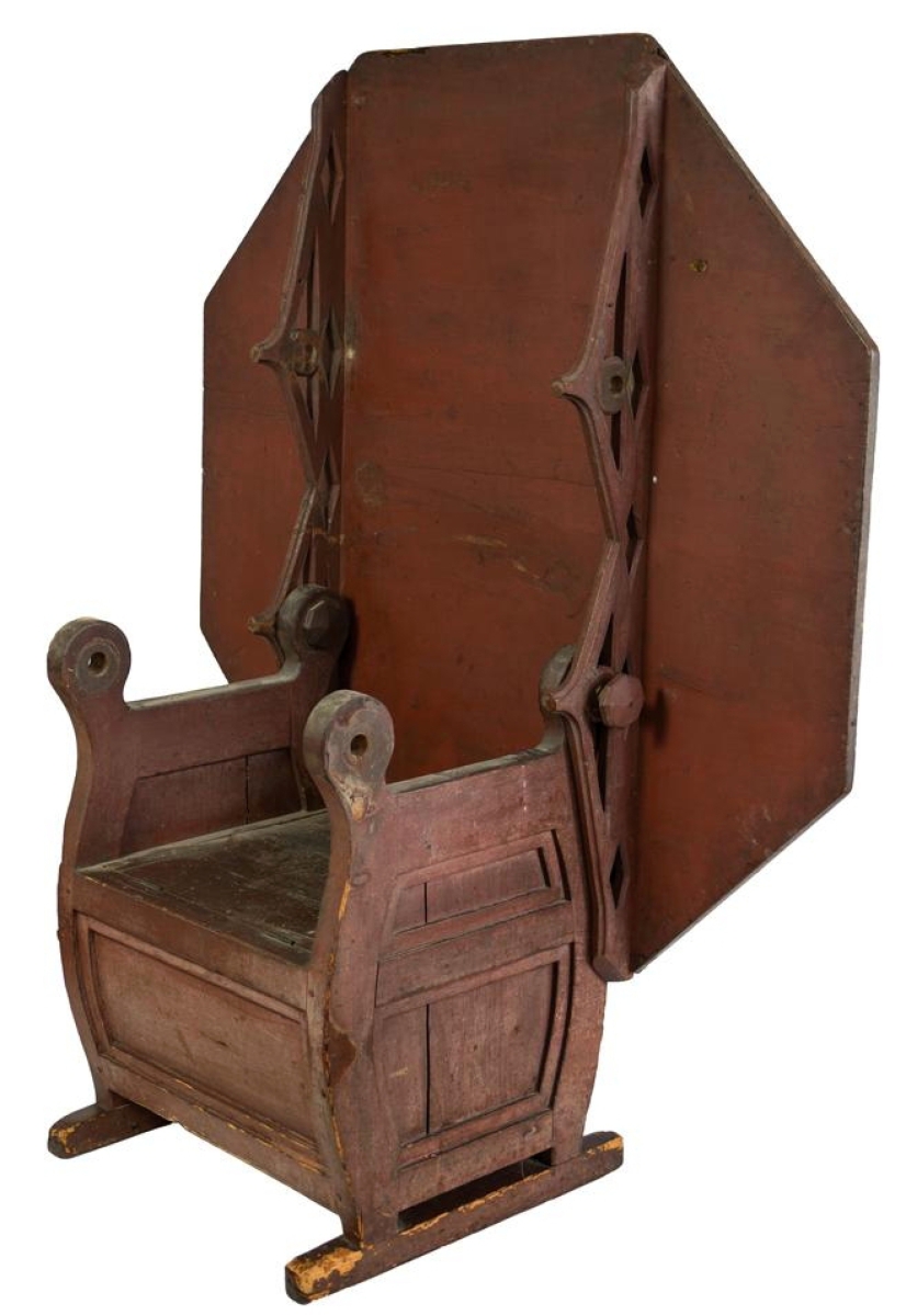 The candlestand, along with most other “brown” furniture, did not bring the expected prices. Early country pieces did much better. An exceptional Eighteenth Century hutch table in old red with an intricately carved and curved base that had been given a full-page illustration in Wallace Nutting’s Furniture Treasury finished at $10,800. Far exceeding the estimate was a chip carved, ten spindle, table top tape loom with a carved date of 1737. Henry said he was unsure if it was American, but bidders probably believed it was, as it reached $7,200. A French Canadian open hutch, with raised triangular paneled doors and pintail hinges, cataloged as Eighteenth Century, also sold over its estimate, finishing at $4,800.