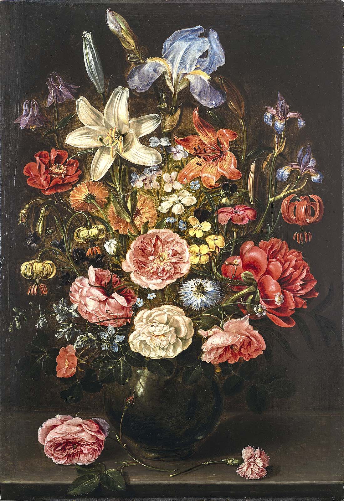 “Roses, Convolvulus, Poppies and Other Flowers in an Urn on a Stone Ledge,” Rachel Ruysch, late 1680s, oil on canvas, National Museum of Women in the Arts.